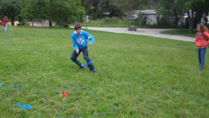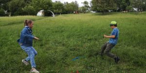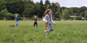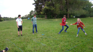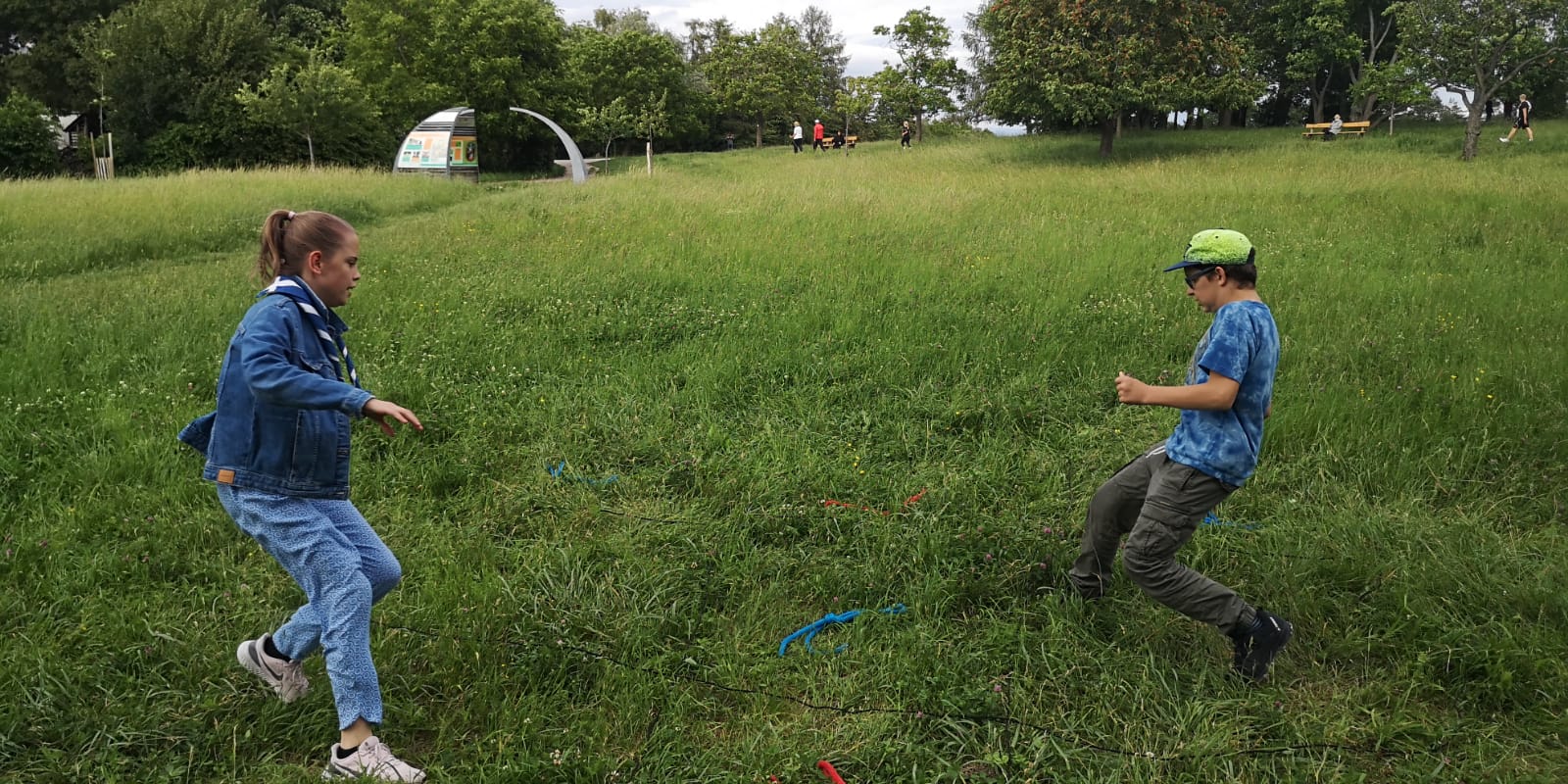 Danach haben sich die Kinder in gleich große Gruppen geteilt, um ein rasantes Tic-Tac-Toe zu spielen; beim Werfen von roten und blauen Schnüren in ein großes 3×3-Feld wurde gerannt, gerutscht, gerufen und gejubelt – spätestens da wussten alle auf den Steinhofgründen: Ja, die 19er sind wieder in Action!
