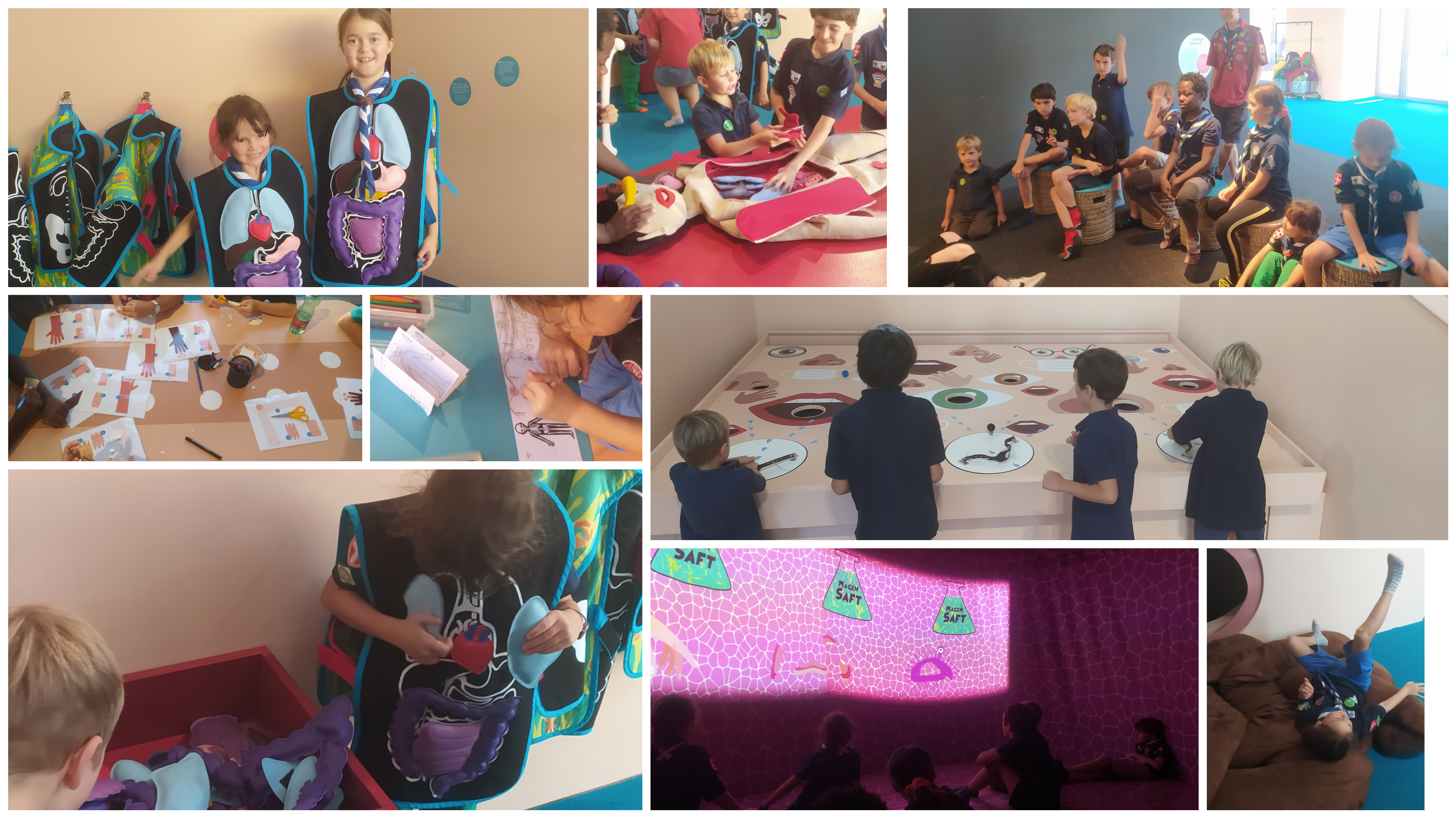 Auf unserem Ausflug haben wir uns intensiv mit dem menschlichen Körper beschäftigt. Am Vormittag haben wir auf den Steinhofgründen bei einer spannenden Partie Cluedo einen verletzen Patienten gefunden und verarztet. Wir haben über erste Hilfe und Verletzungen aller Art gesprochen und im Anschluss unser Wissen über unseren Körper auf sie Probe gestellt. Nach einer aktiven Mittagspause am Spielplatz haben wir uns dann auf den Weg zum ZOOM Kindermuseum gemacht, wo wir die Ausstellung „Von Kopf bis Fuß“ besucht haben. Dort konnten die Kinder den menschlichen Körper buchstäblich von Kopf bis Fuß durchwandern und dabei Neues über unsere Anatomie lernen.
